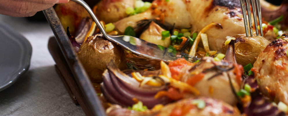 The Arabic word for baking dish is “suniya” or “suniyat” so this literally translates to baked chicken, and this Jordanian hearty meal is very easy to cook. This popular dish has many variations – not only can you change the vegetables to what is in season, but why not try it with a different meat or even with aubergine as a vegetarian alternative (just remember to adjust your cooking time). While it can be served on its own, feel free to add a pitta bread or some rice on the side.